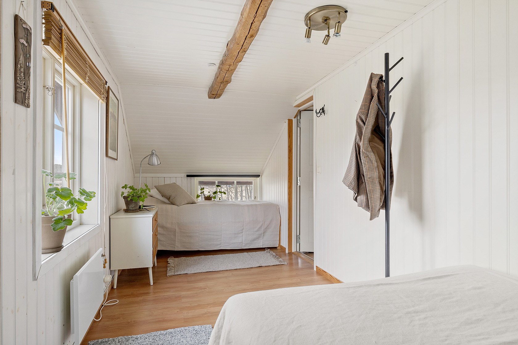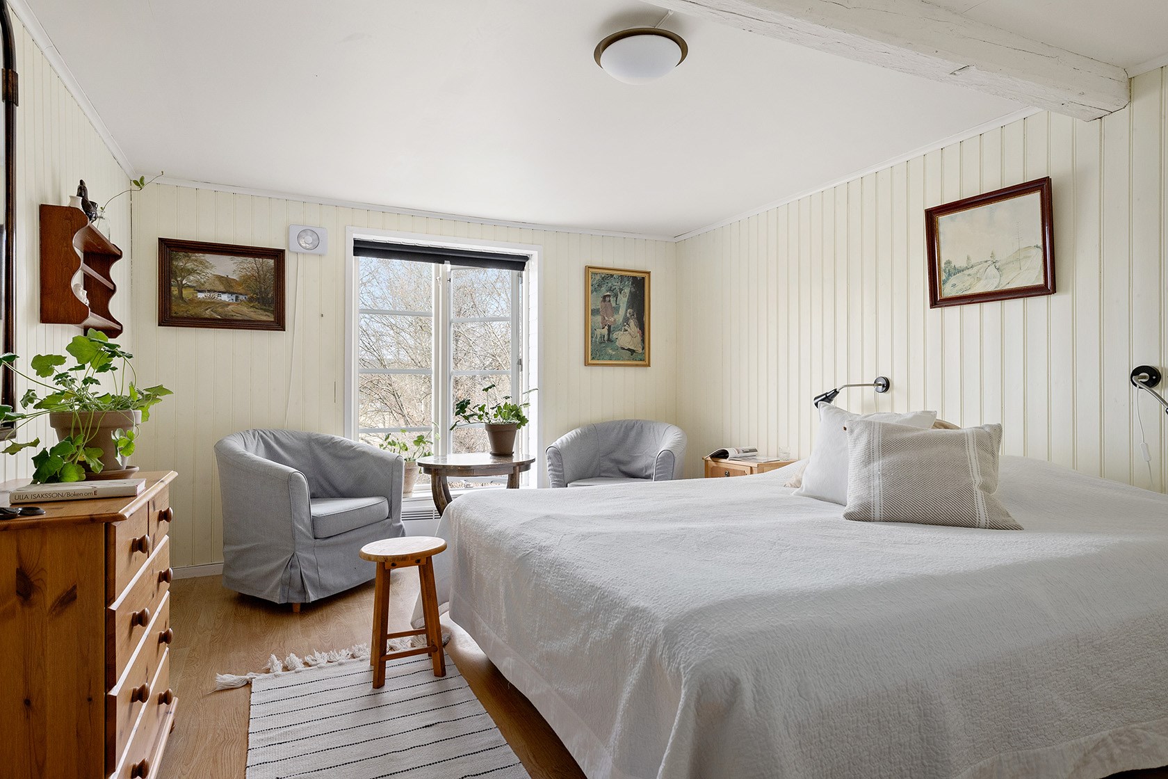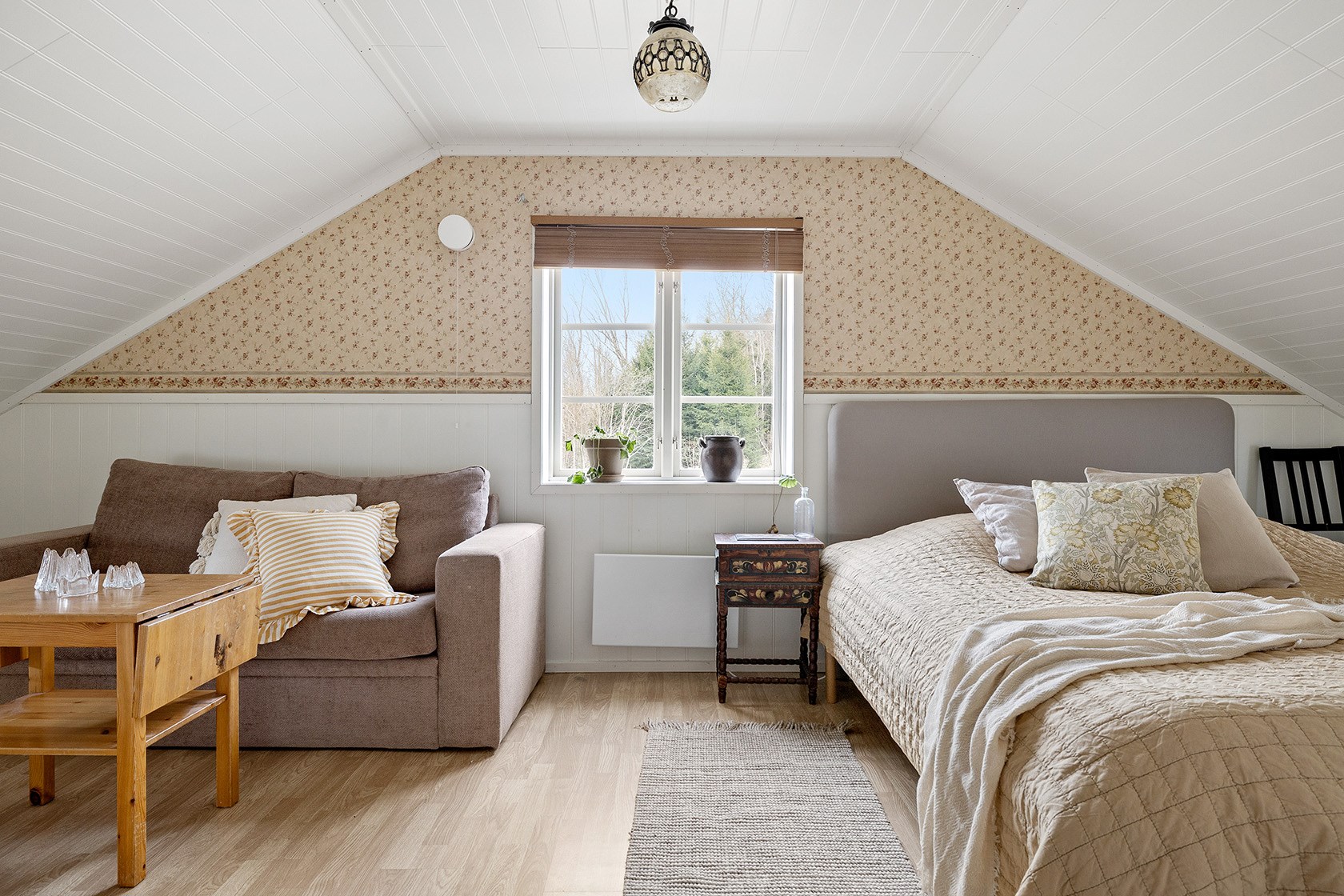 På övervåningen i annexet har vi detta trevliga rum med utsikt över ängar och Göta älv. Utrustad med en dubbelsäng och en bäddsoffa.