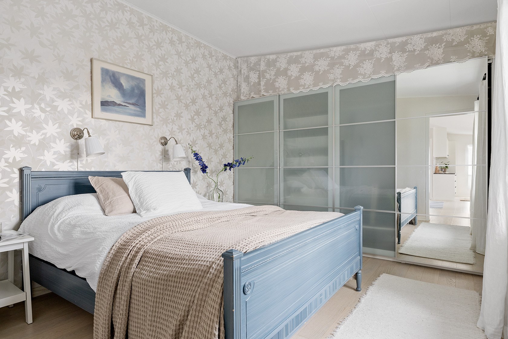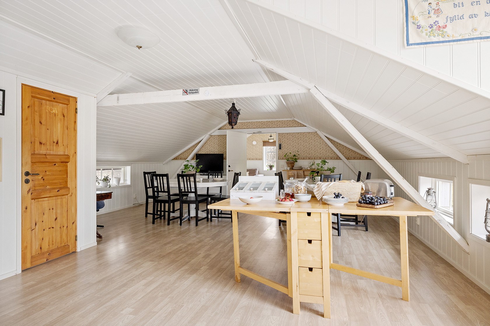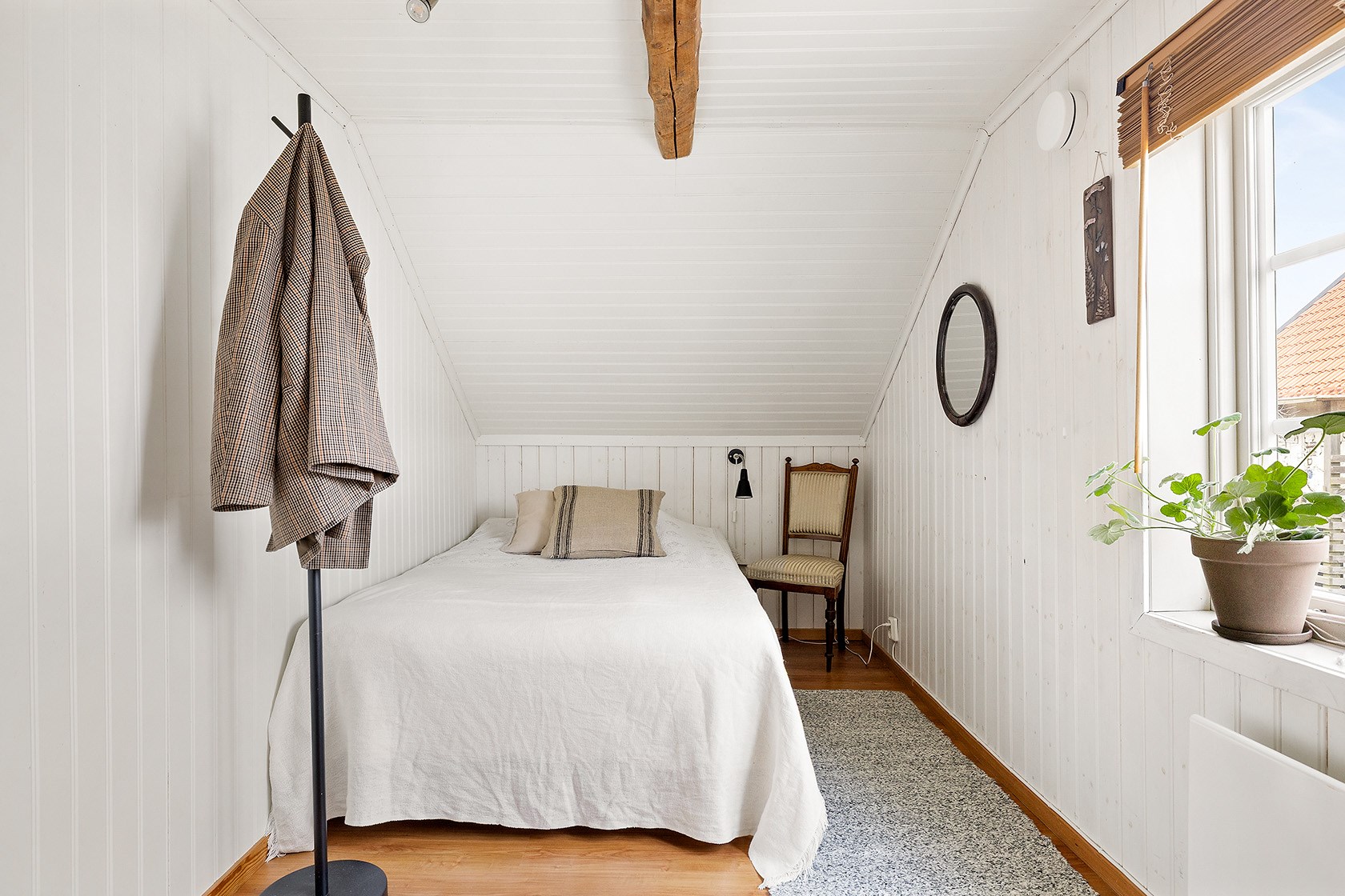 På övervåningen i annexet har vi detta trevliga rum med utsikt över ängar och Göta älv. Utrustad med en dubbelsäng och en bäddsoffa.