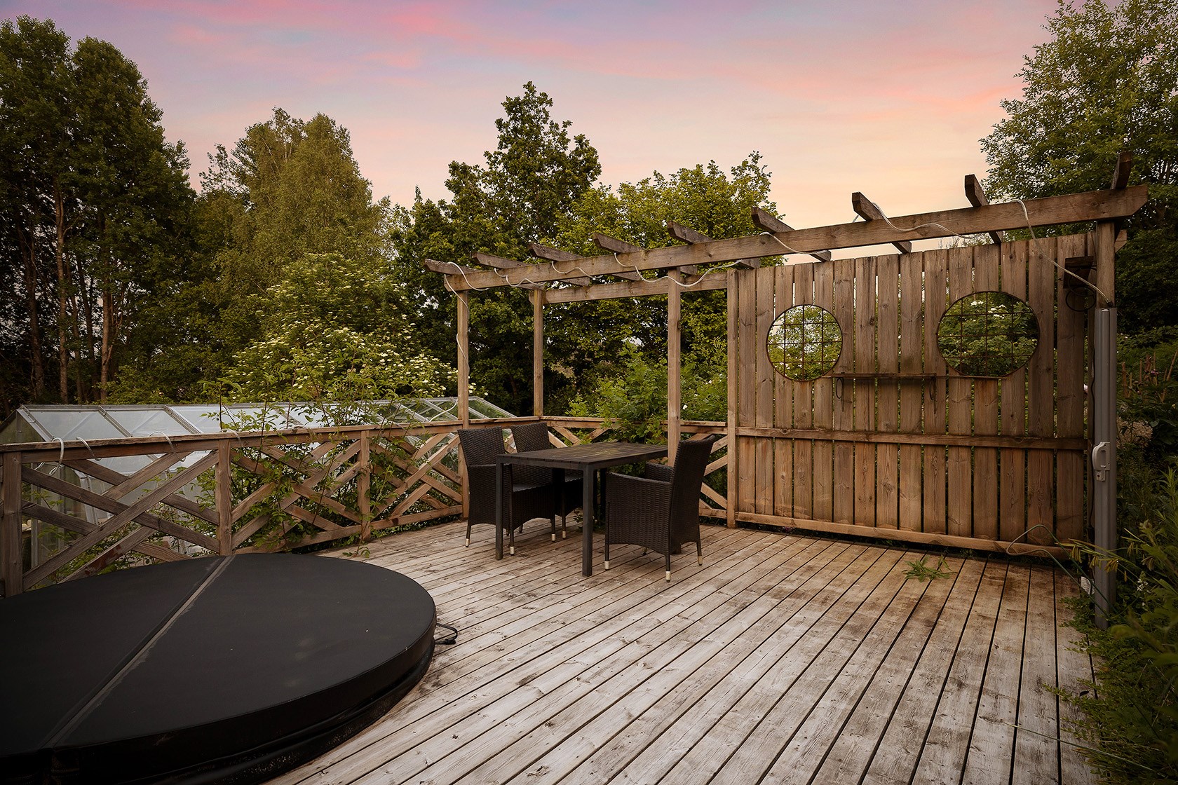 I vår trädgård finns flera grillplatser med sittgrupper, där du kan njuta av den fantastiska utsikten över älvdalen.